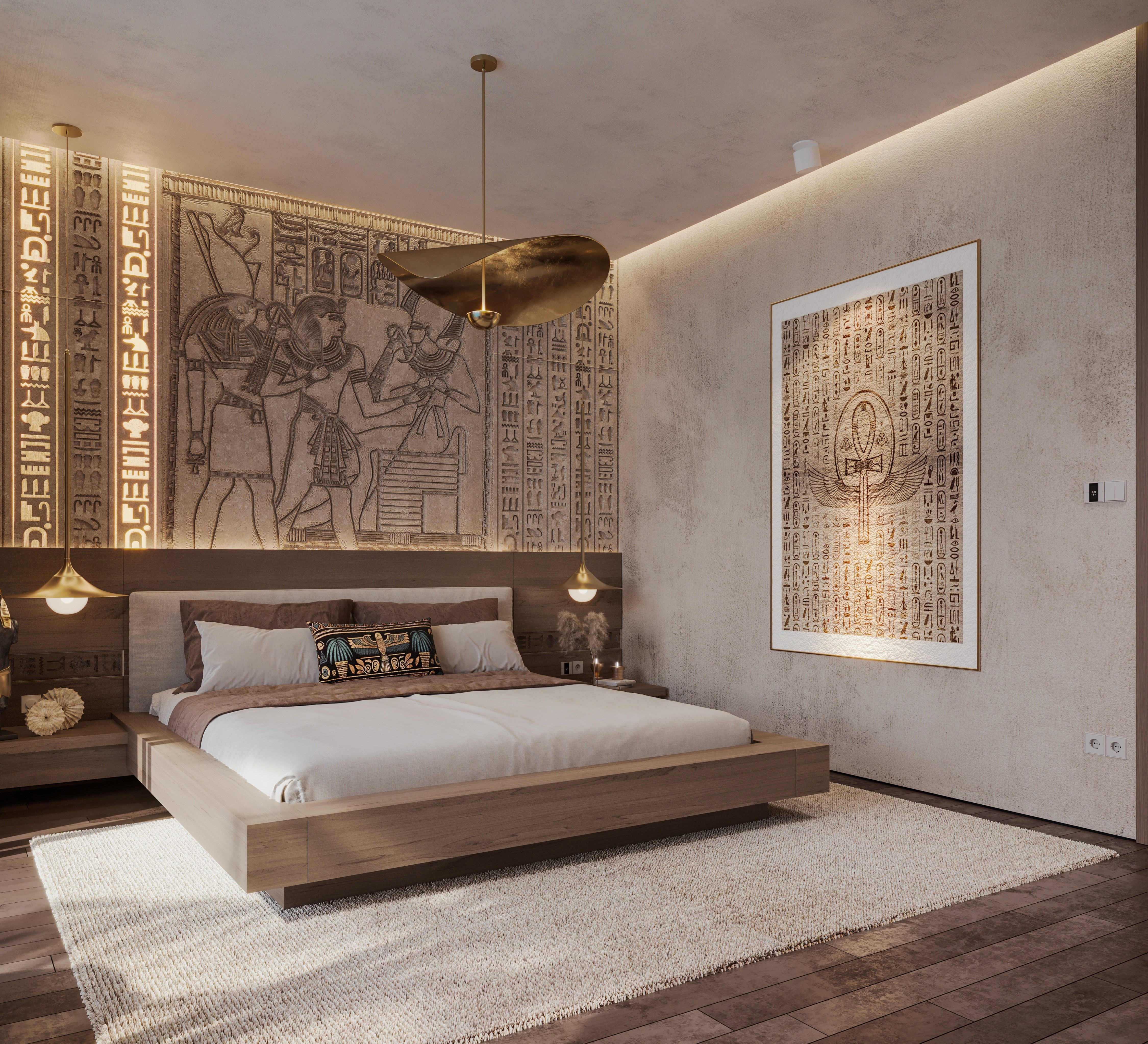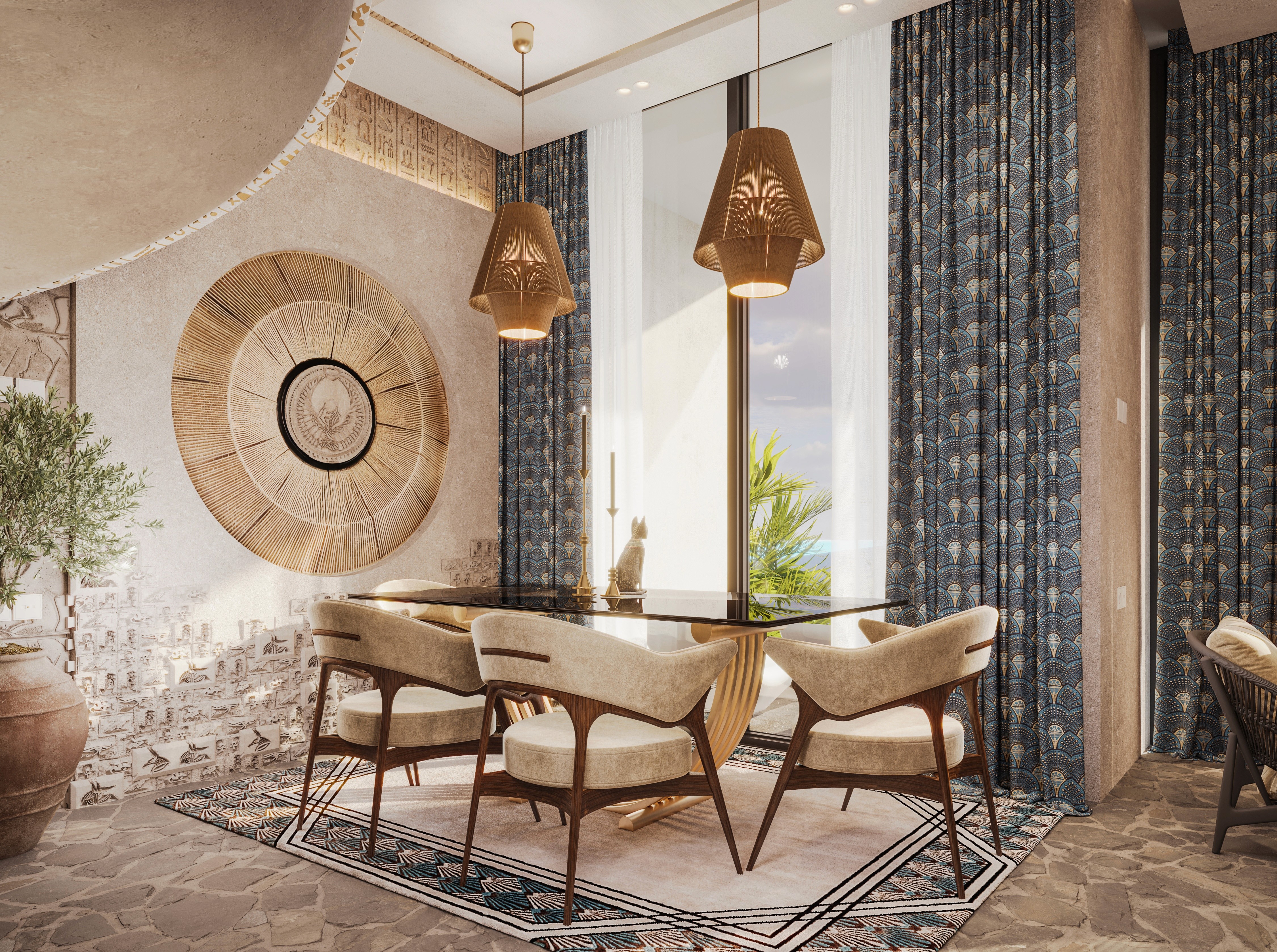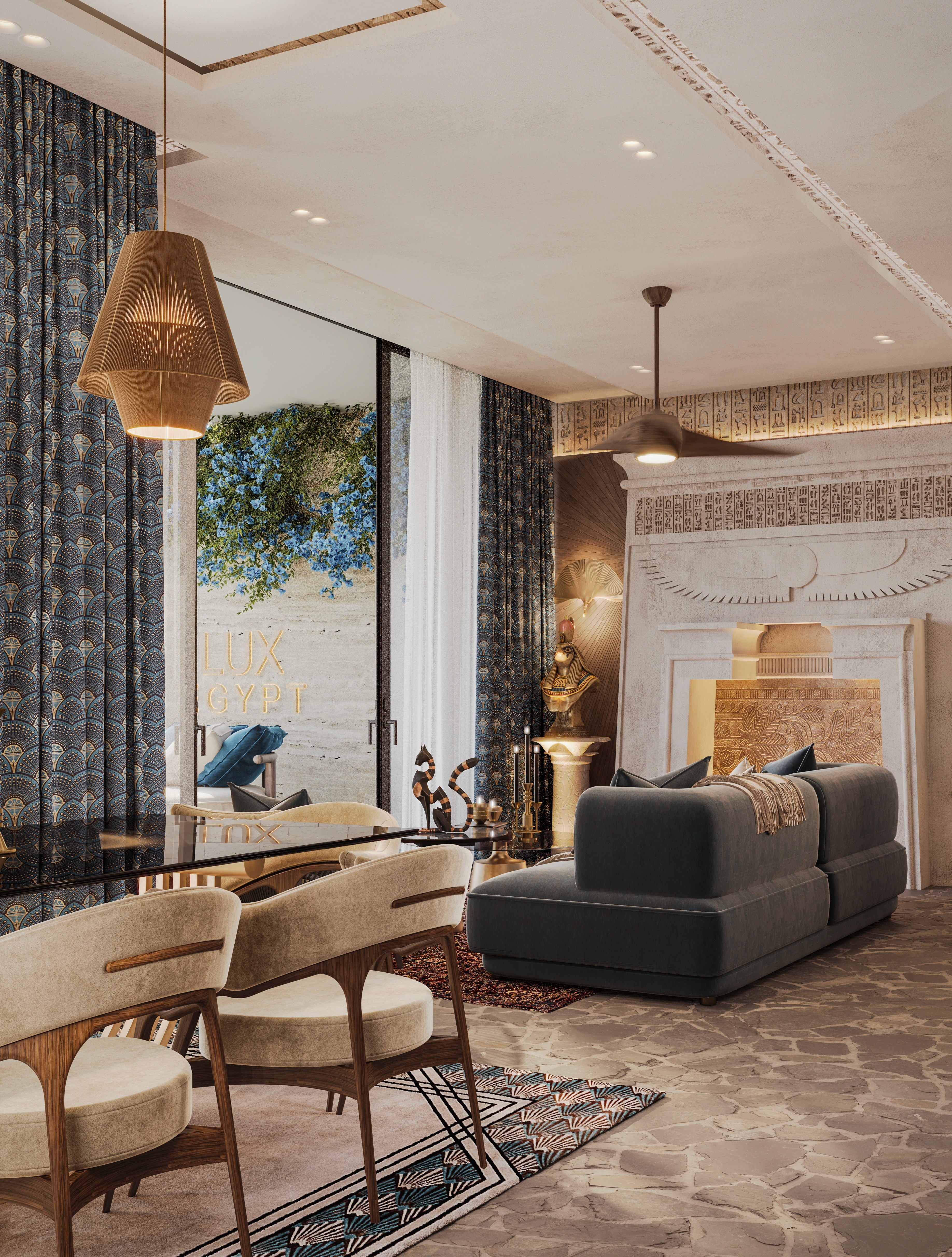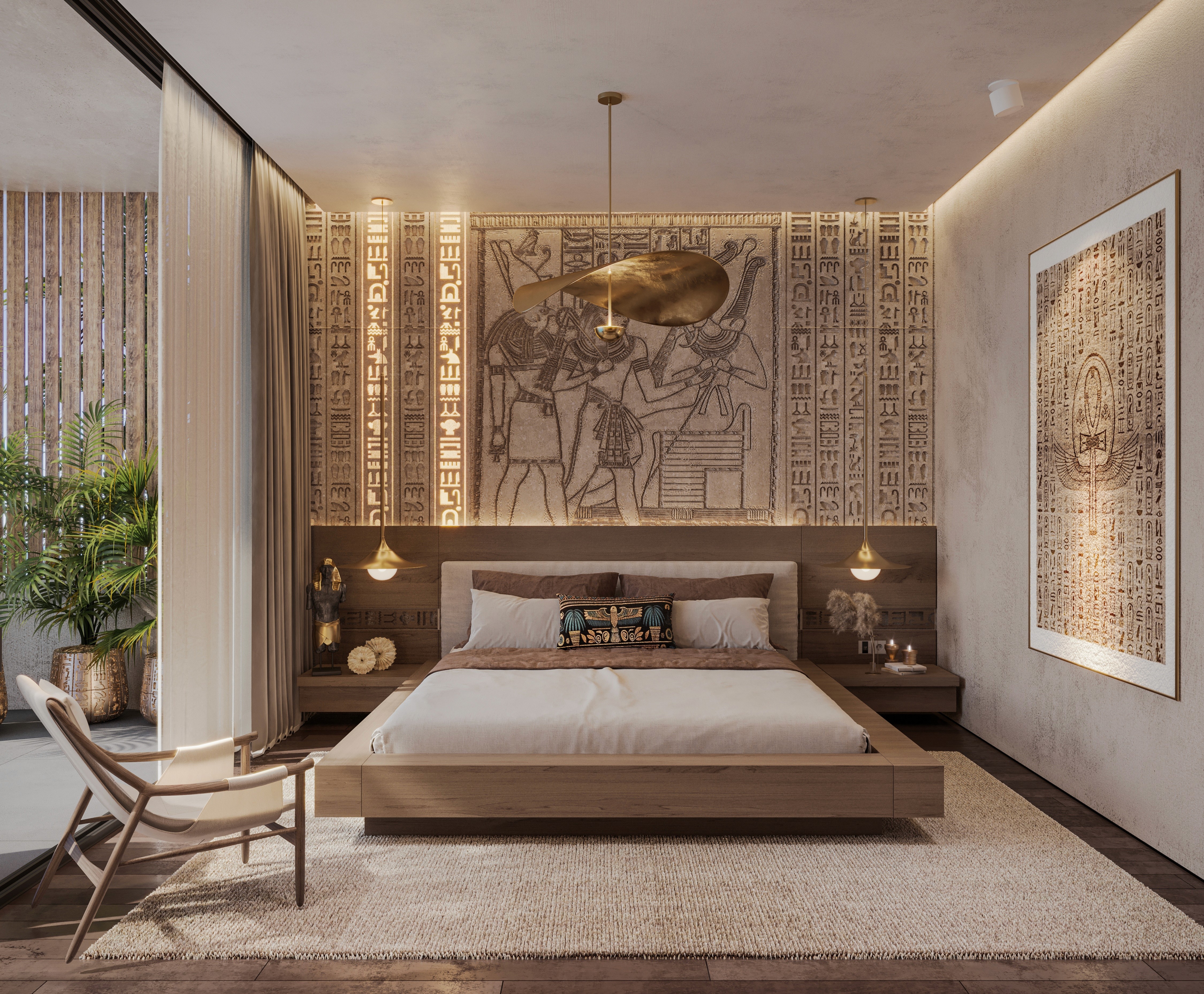 The design seamlessly combines ancient artefacts and inscription details with modern luxury. Each element reflects the majesty of Egypt. Offering a retreat that feels both regal and intimately luxurious, where history and elegance collide together.