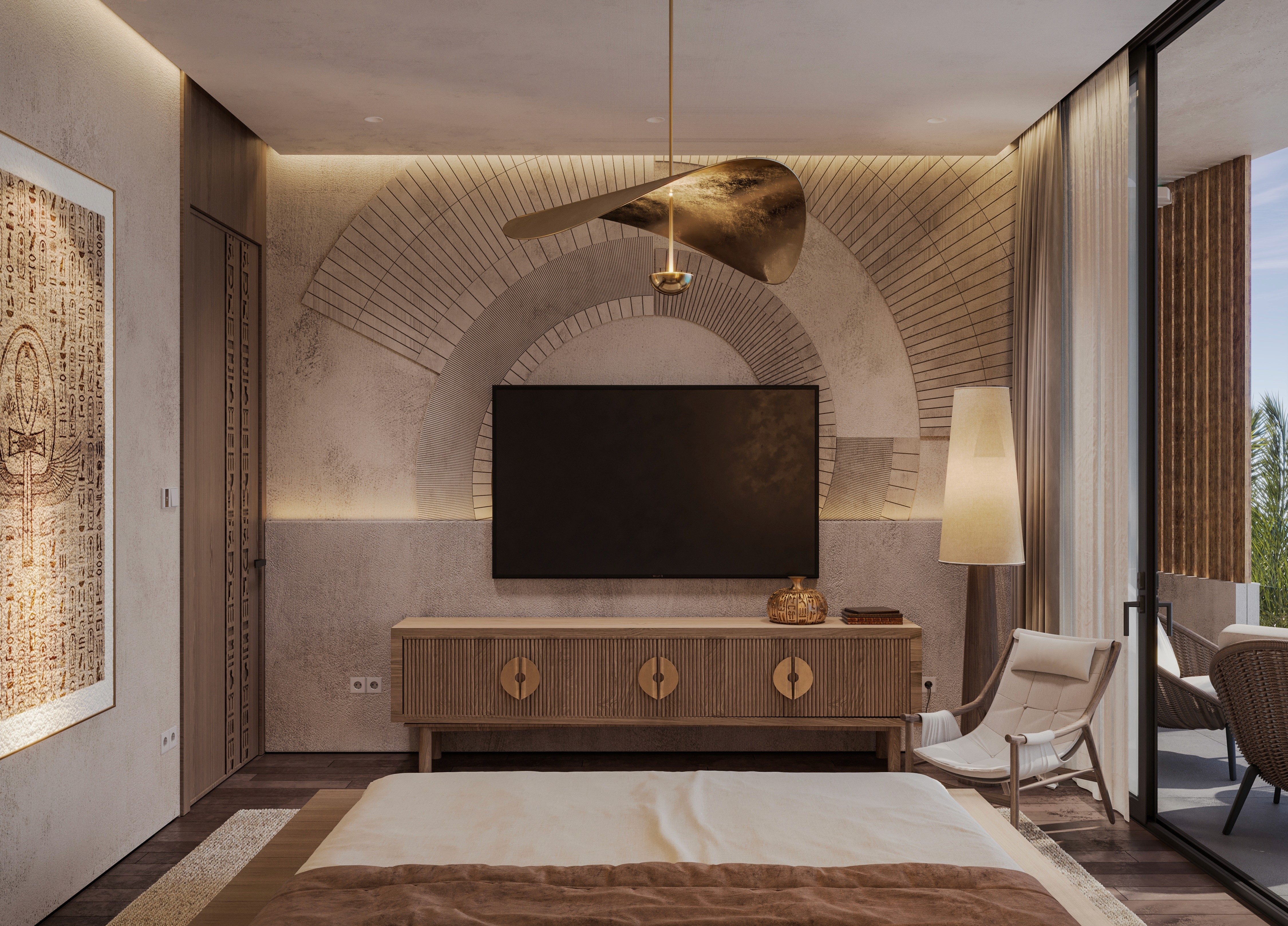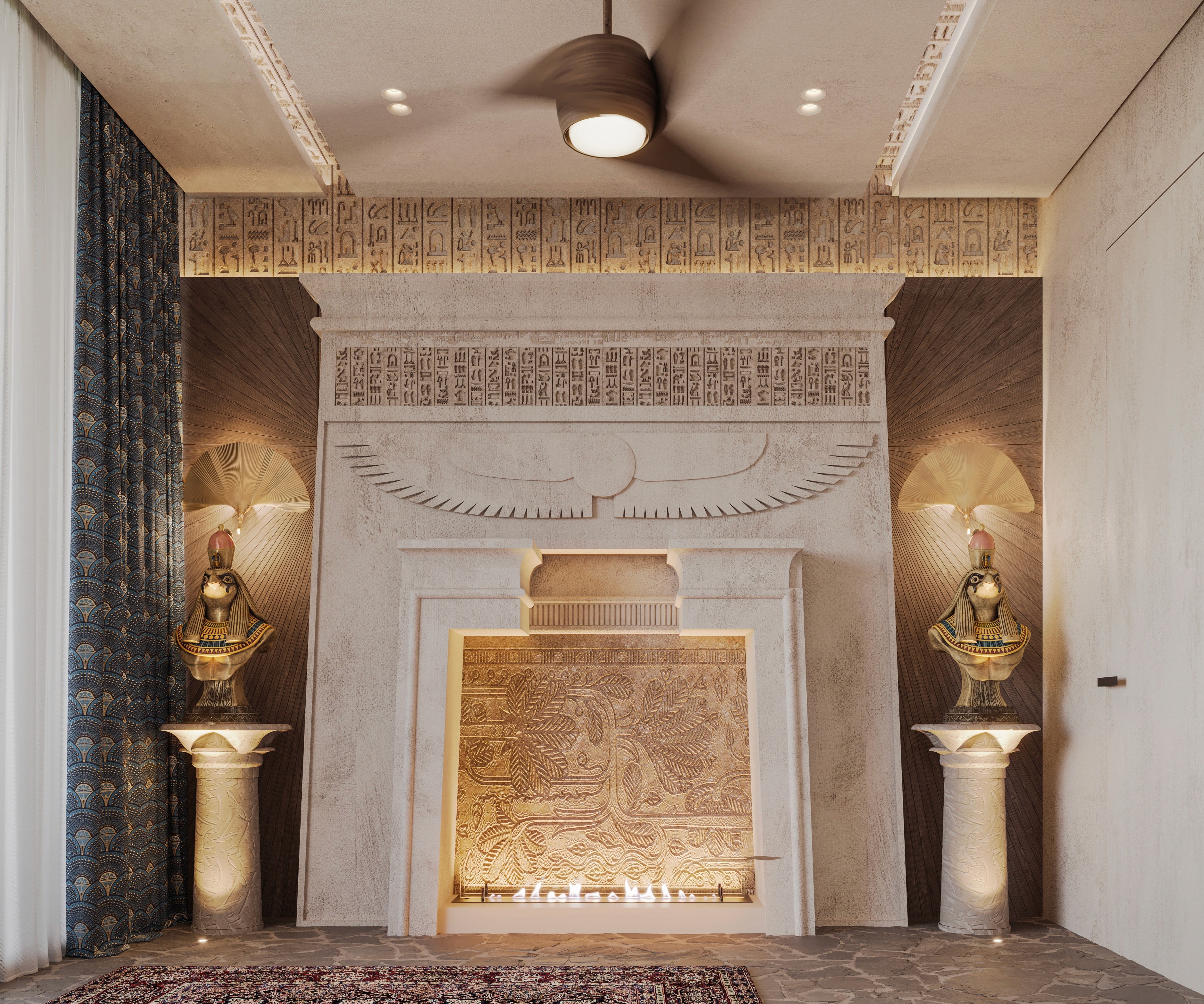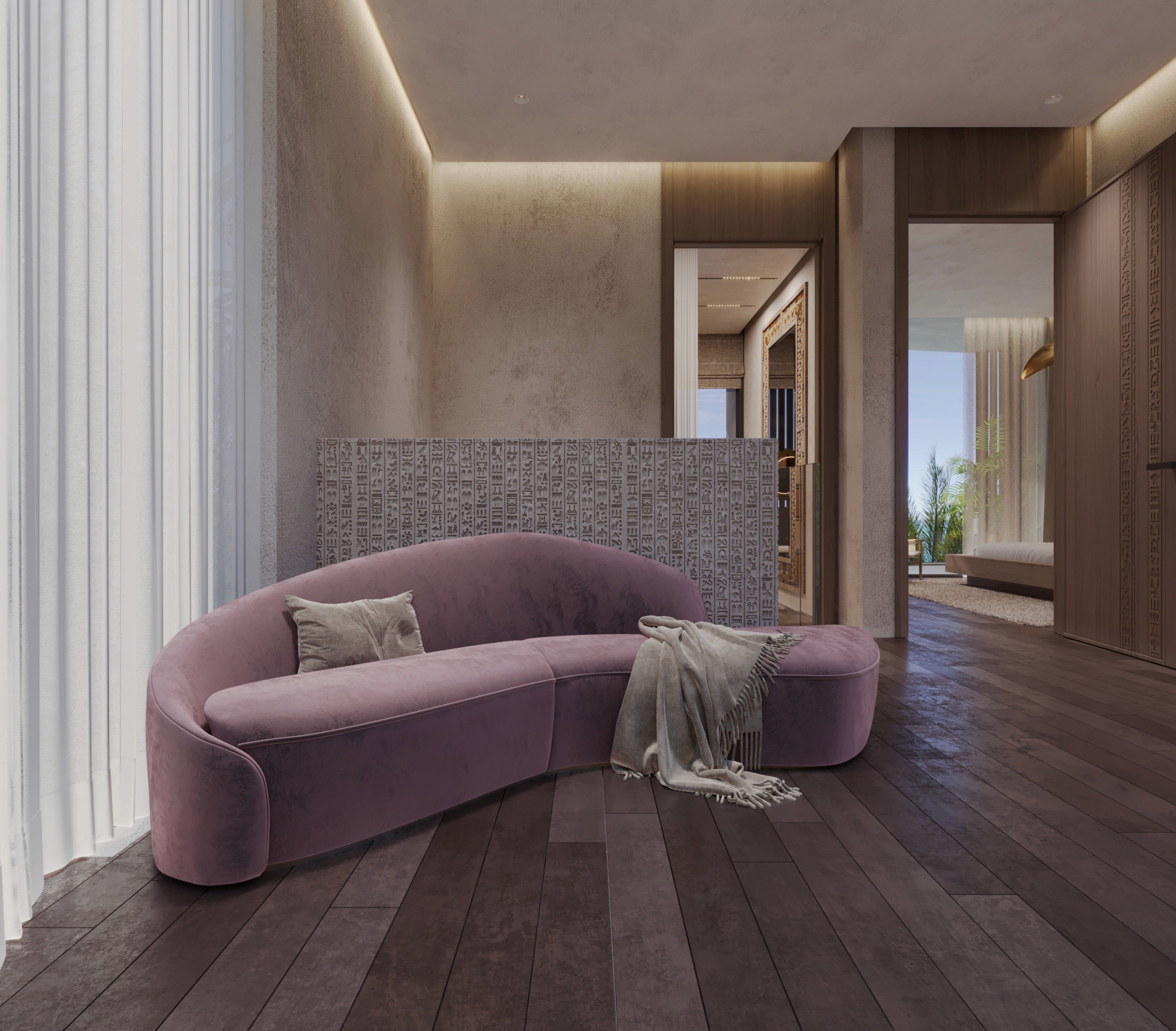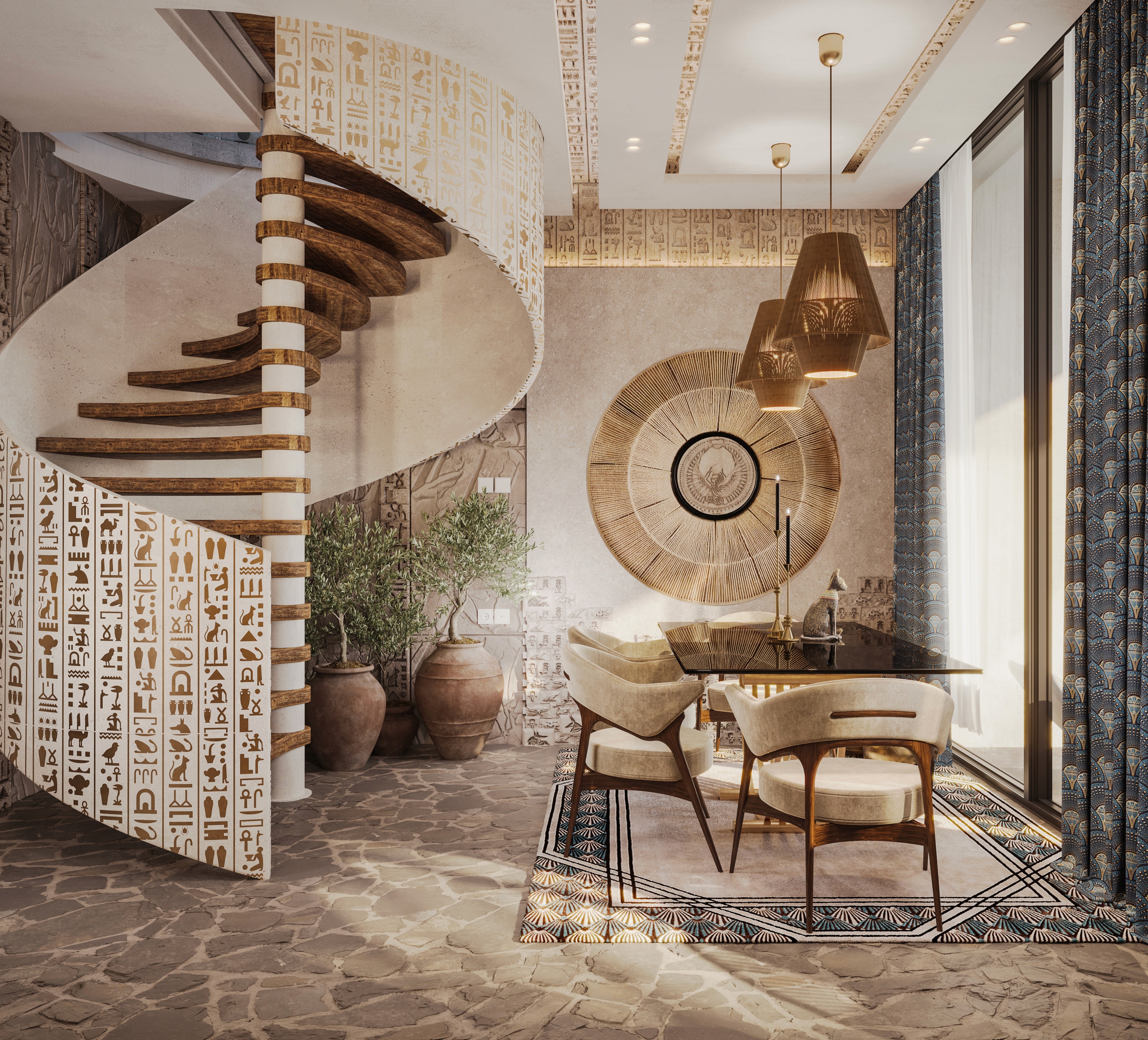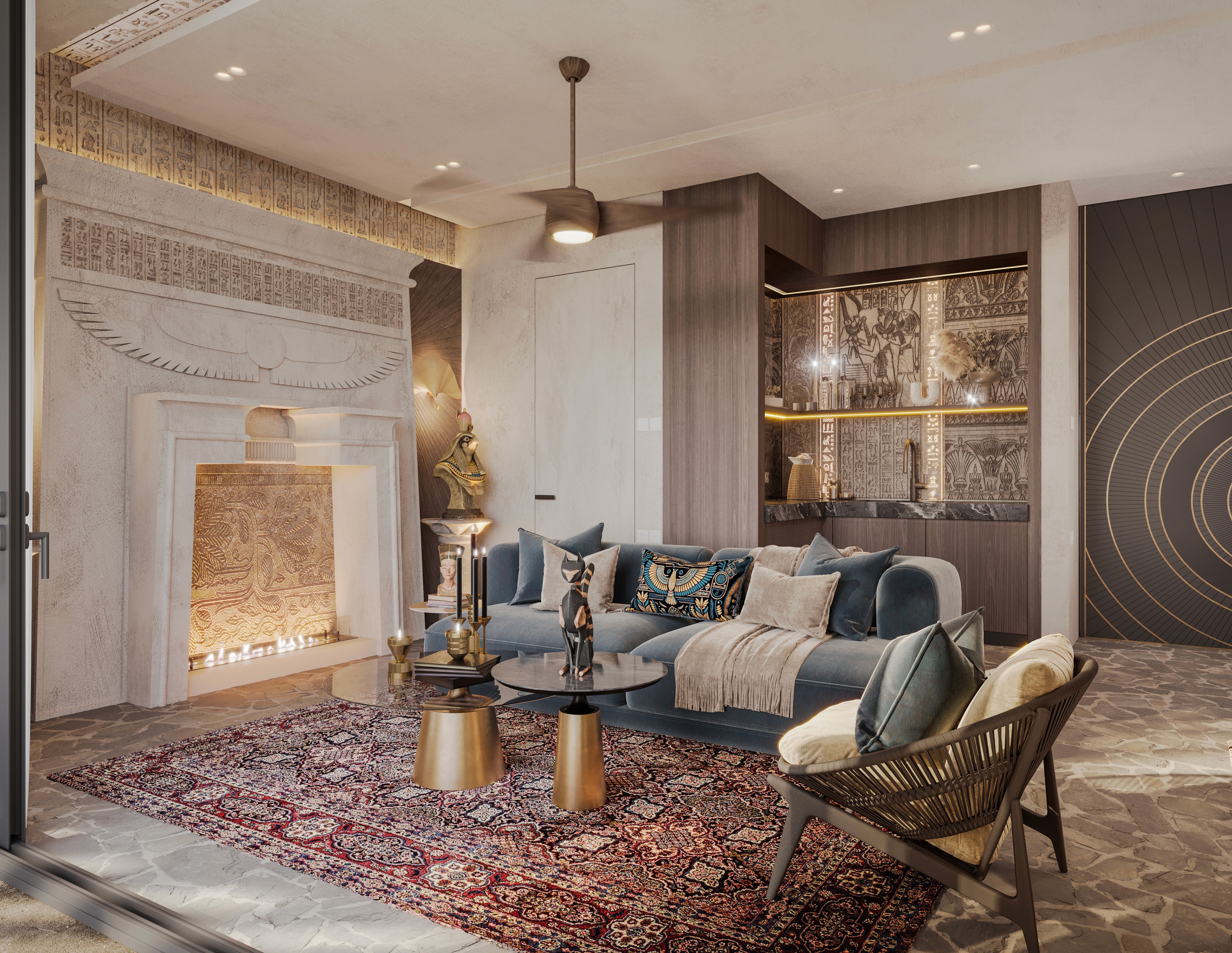The design seamlessly combines ancient artefacts and inscription details with modern luxury. Each element reflects the majesty of Egypt. Offering a retreat that feels both regal and intimately luxurious, where history and elegance collide together.