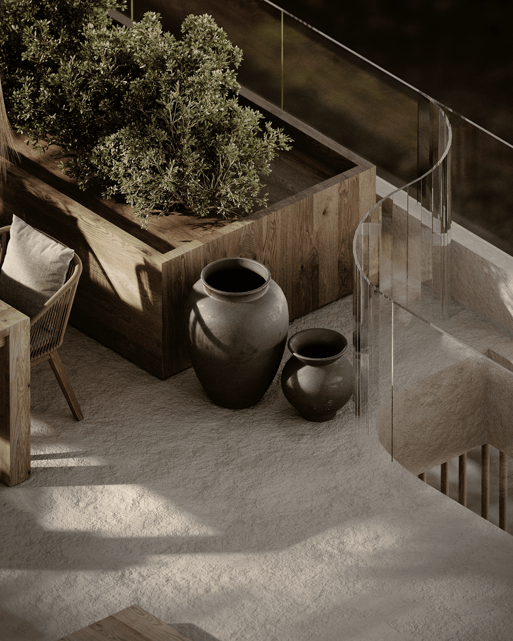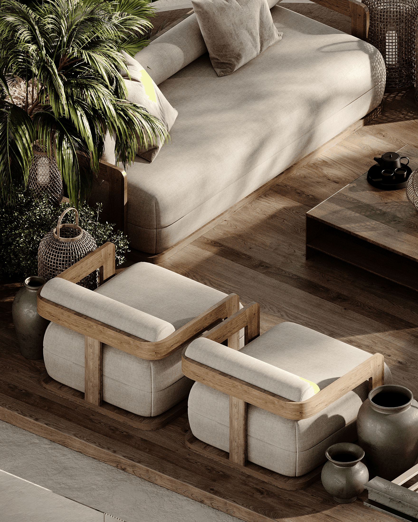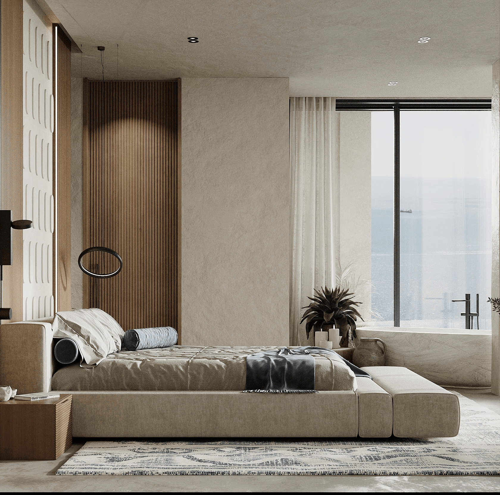 Rustic wooden details are integrated into the two bedroom villa, as a warm contrast to the sleek, minimalistic design. The raw textures bring you an authentic, cosy feel of Greece.